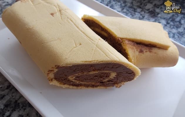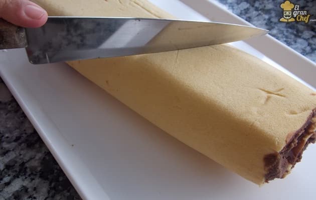 Una vez enrollado, con un cuchillo haz un corte diagonal casi llegando a la punta del pionono