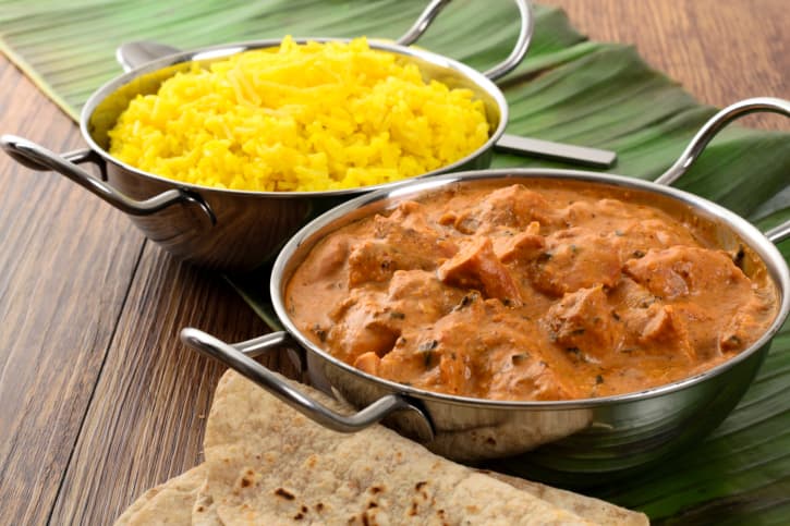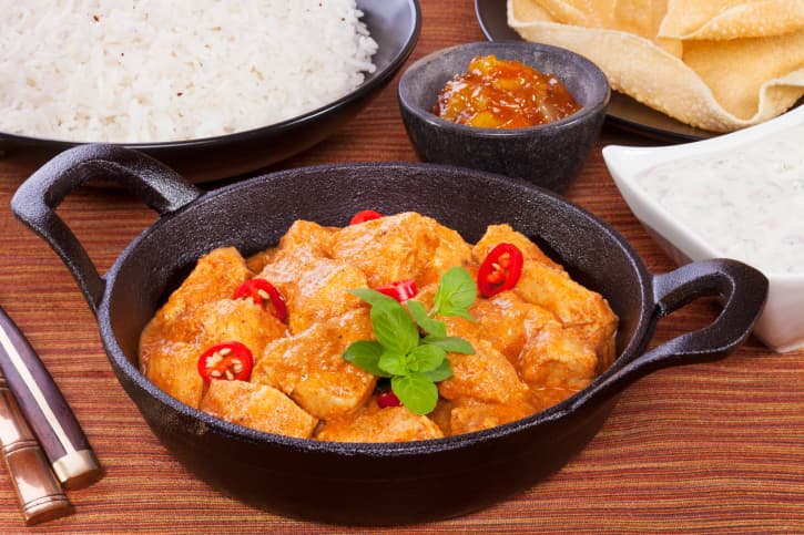 Este plato se sirve normalmante con Naan, pan chato de la India, o con arroz blanco.