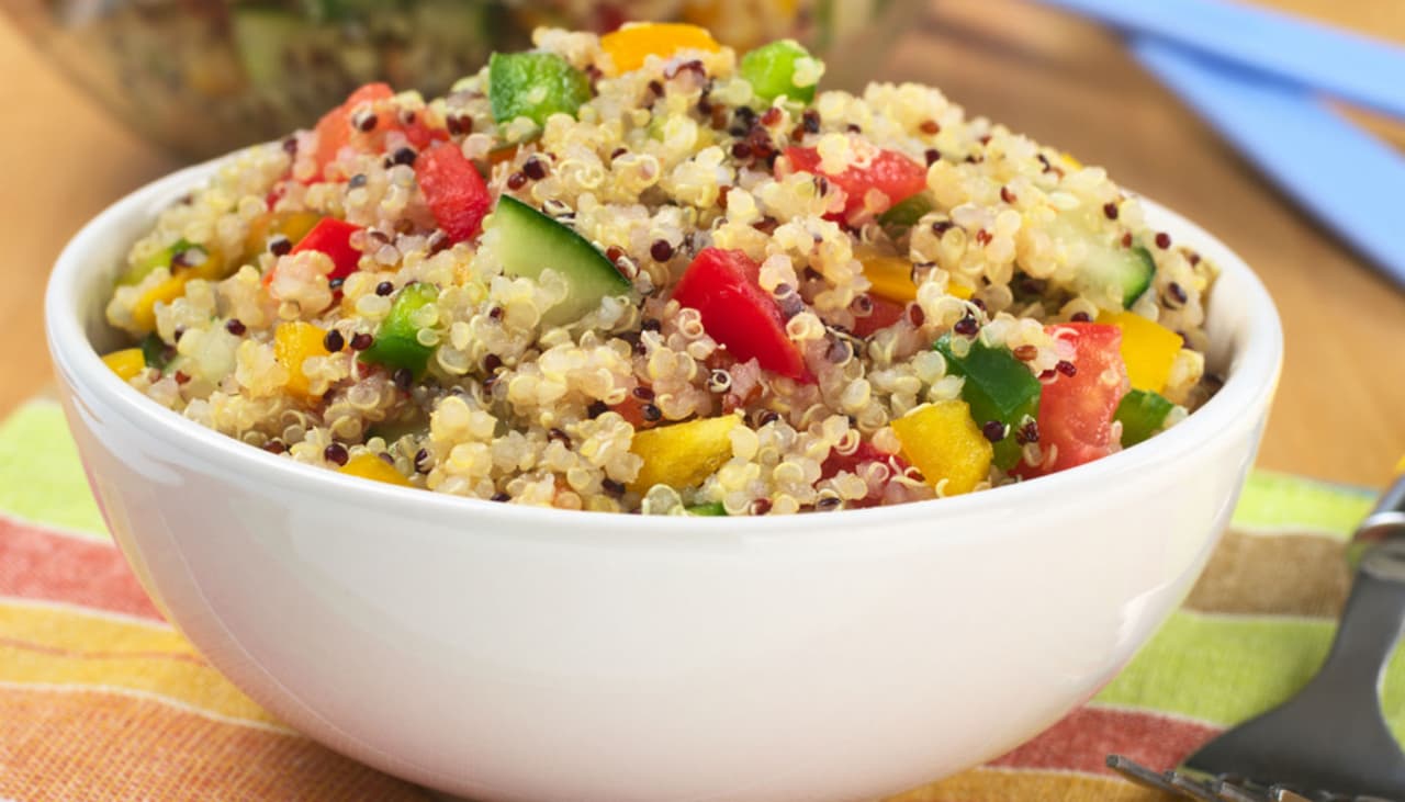 Pon la quinoa en agua hirviendo y, con la olla parcialmente tapada, cocina con un poco de sal hasta que el agua se seque (unos 25 minutos). Pica los tomates, la cebolla y las castañas. Cuando la quinoa se enfríe, mezcla todo, sazona a gusto y separa en porciones.