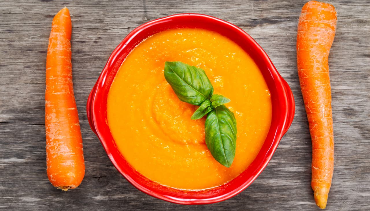 Hierve las zanahorias y procésalas en la licuadora junto con el jengibre y el agua hasta lograr una consistencia cremosa. Calienta el aceite de coco en una olla y agrega la cebolla. Después de dorarla, pon la crema de zanahoria, el tomillo, el curry y la sal. Deja que hierva y apaga el fuego. Decora con un poco de perejil.