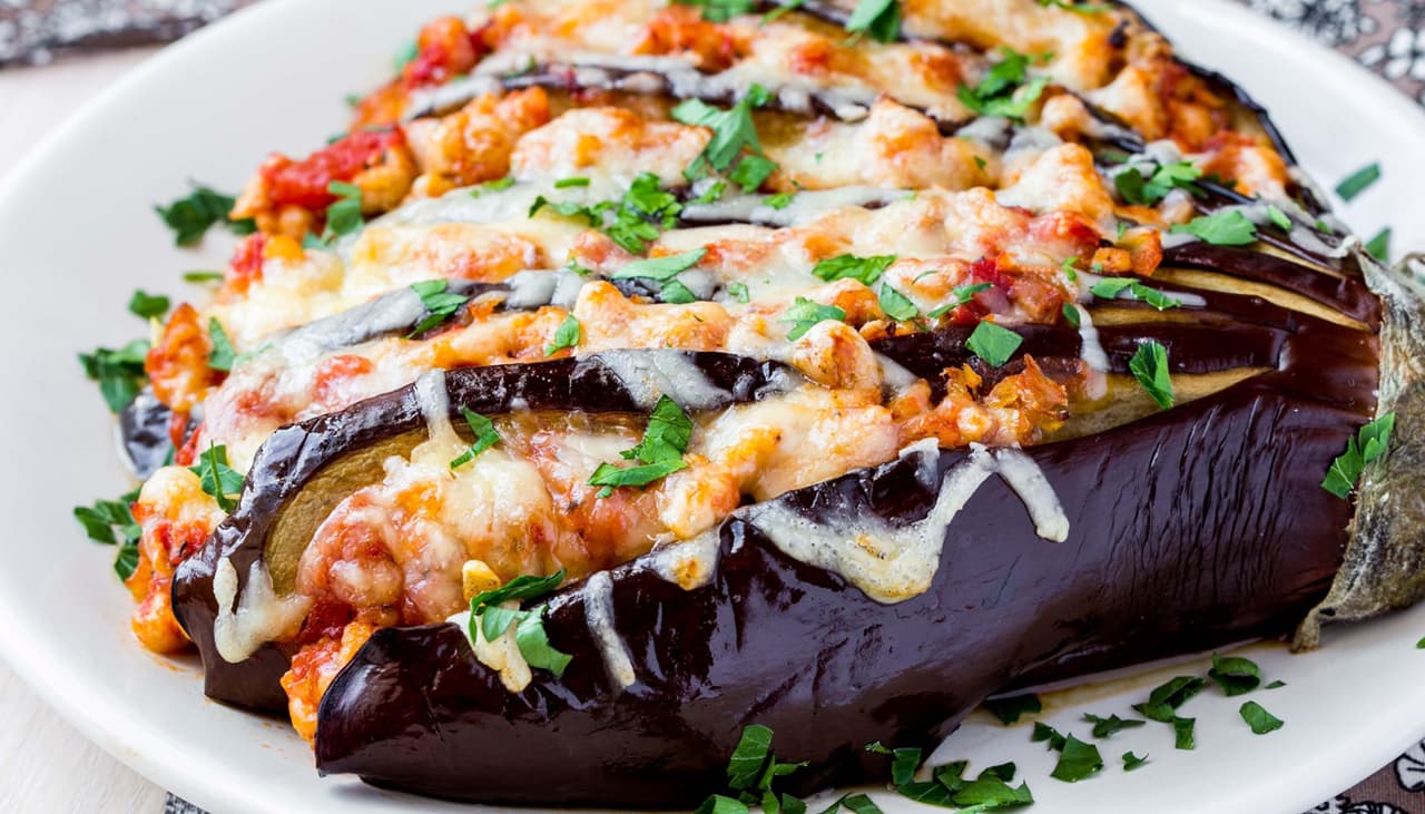 Corta transversalmente la berenjena y quita parte del medio, tiene que quedar una cavidad para rellenar. Pica lo que quitaste de la berenjena con el resto de los ingredientes y pon todo en una olla a fuego lento. Después, fuera del fuego, mezcla la preparación con la ricotta hasta que se convierta en un paté. Rellena las berenjenas y llévalas al horno durante 30 minutos.