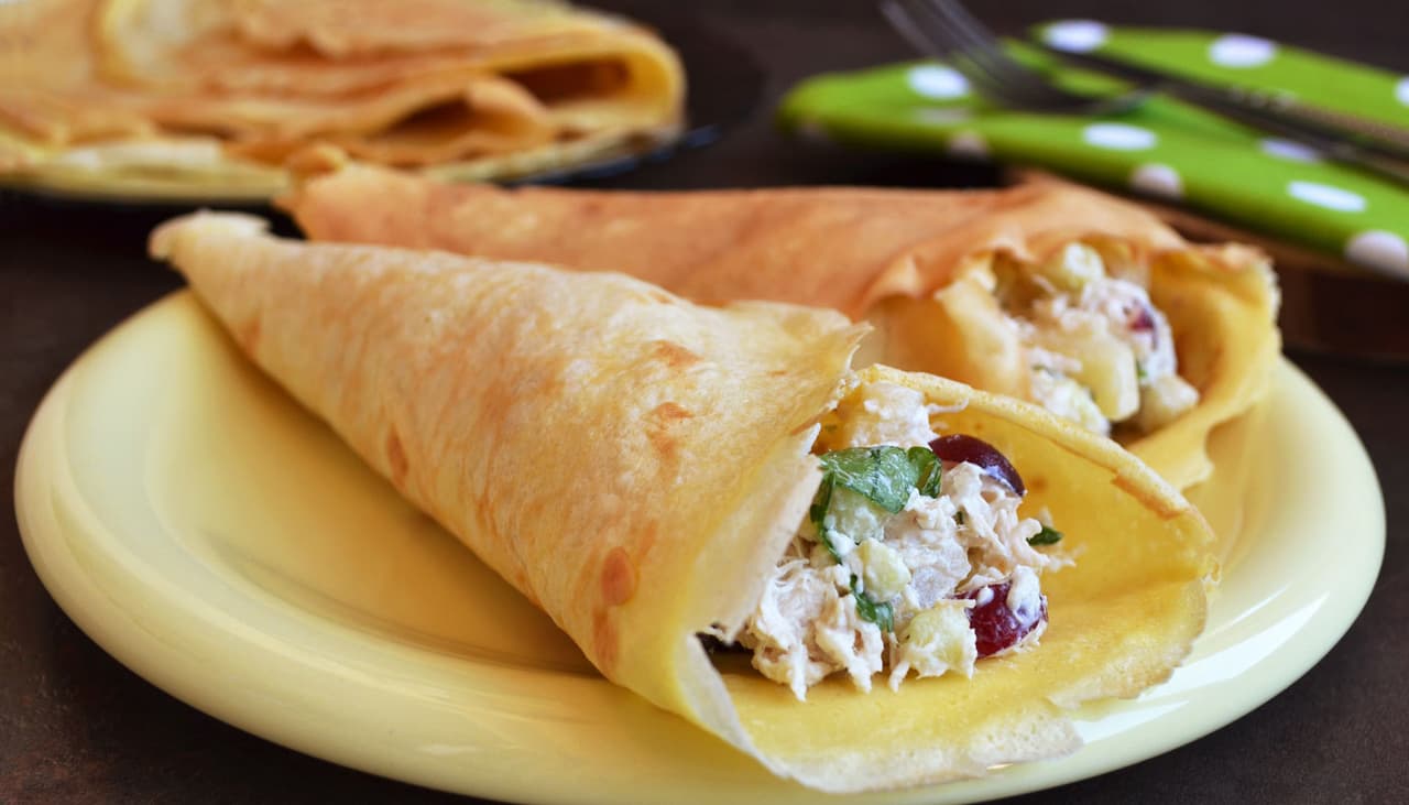 Para el relleno, cocina la pechuga de pollo y después desmenúzala. Lleva el pollo a una olla con un poco de aceite y saltéalo con los otros ingredientes del relleno. Cocina por algunos minutos. Apaga el fuego y reserva. Luego, rellena los panqueques y ponlos en el horno durante 20 minutos a temperatura media.