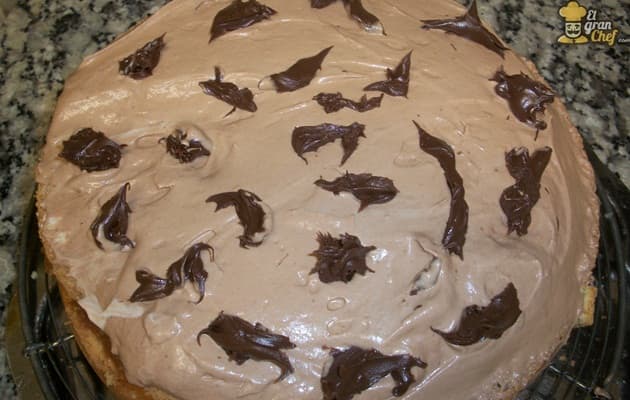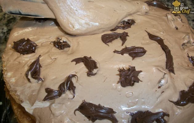 Después, colocamos una delgada capa de mousse nuevamente para cubrir estos "trozos" de Nutella, y no cueste adherir la capa superior de bizcochuelo.