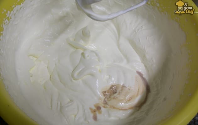 Batimos la crema a medio punto, con la ayuda de una batidora eléctrica. Agregamos, opcionalmente, esencia de vainilla para ayudar a anular el sabor natural de la crema de leche.