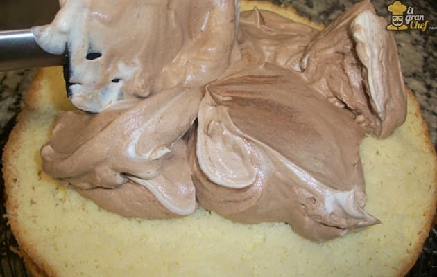 Colocamos sobre el bizcochuelo, previamente humedecido con almíbar que ya hemos aprendido.