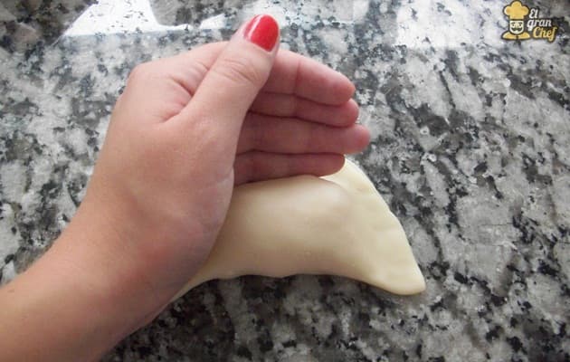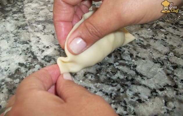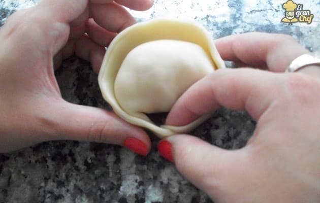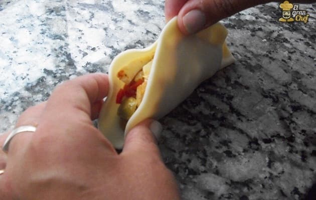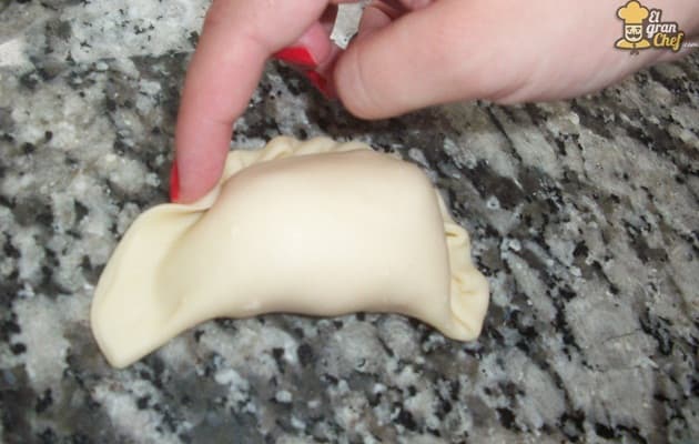 Ahora, comenzamos a cerrarla para que no se nos escape el relleno y queden bien prolijas luego de la cocción. Para ello, levantamos una puntita con el dedo índice; si somos diestros, el extremo que levantamos será el derecho para seguir el repulgue de derecha a izquierda.