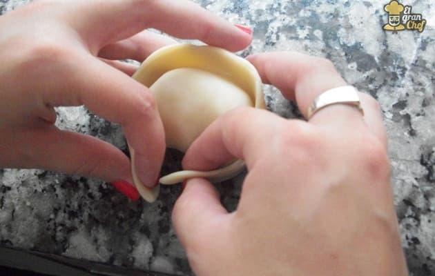Presionamos la unión para evitar que se abran en el horno o en la fritura. En este caso, la empanada queda como un Cappeletti (pasta rellena).