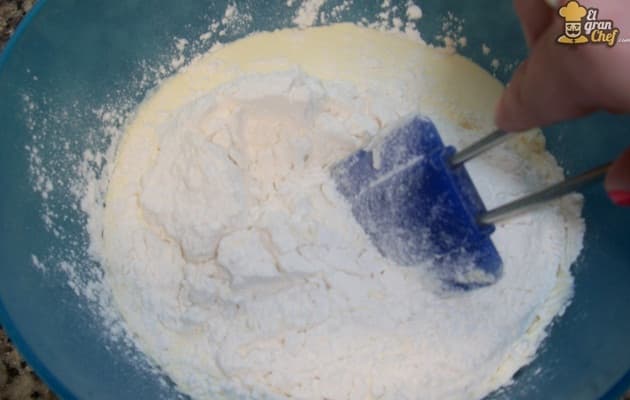 Agregamos ambas harinas, medidas con el pote de nata. Mezclamos hasta formar una masa.
