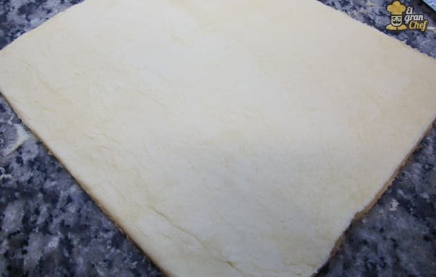 Estiramos la masa hasta que nos quede de 5 milímetros de grosor. Para lograr mayor prolijidad, podemos recortar los bordes.