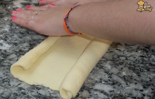 Enrollamos un lado de la masa hasta el centro de la misma. Repetimos el procedimiento con el lado opuesto.