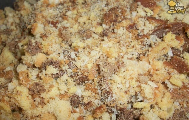 Ponemos en un bowl las vainillas desmenuzadas con la mano (también podemos usar algún bizcochuelo que haya sobrado suplantando las vainillas).