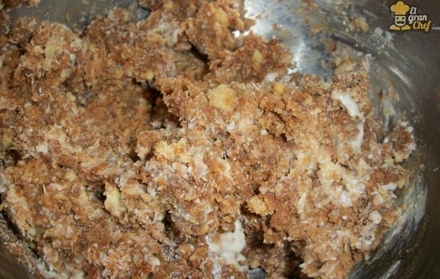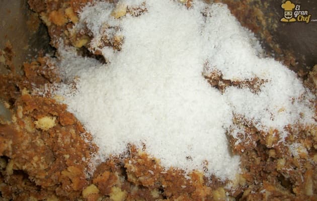 A la masa formada con las vainillas, el dulce de leche y la bebida alcohólica, agregamos el coco rallado y seguimos uniendo.