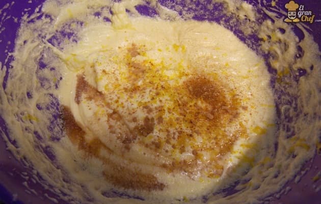 Agregamos la canela en polvo, la ralladura de limón y un poco de esencia de vainilla. Continuamos batiendo.
