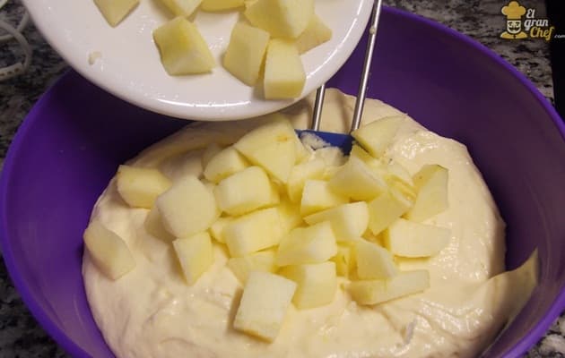 Incorporamos a la preparación las manzanas cortadas previamente en forma de cubos. Mezclamos.