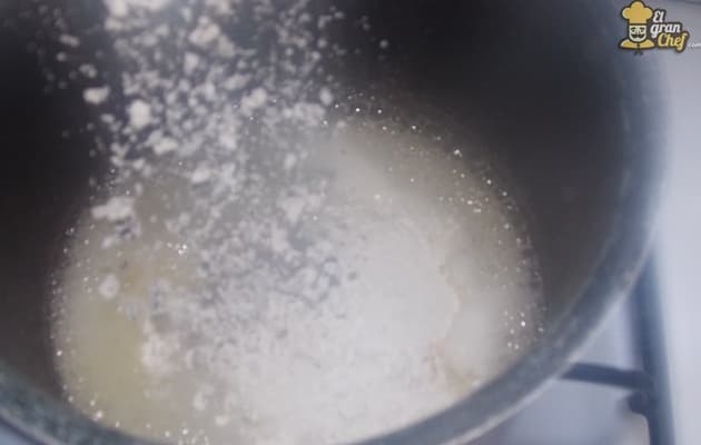 Una vez que la preparación llegó a punto de hervor y la manteca esté derretida, volcar la taza de harina de golpe y comenzar a mezclar rápidamente con cuchara de madera.