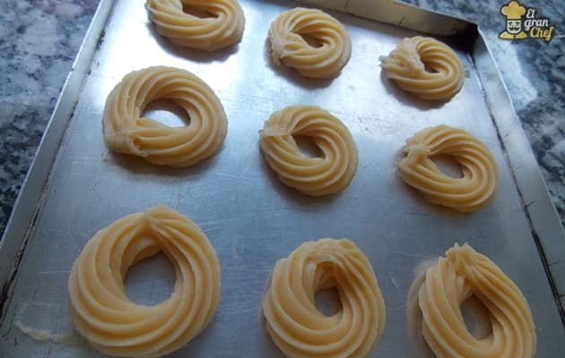 Sobre una placa limpia, formar las rosquitas usando la manga. Debemos dejar cierto espacio entre ellas para que cuando crezcan no se peguen entre ellas.