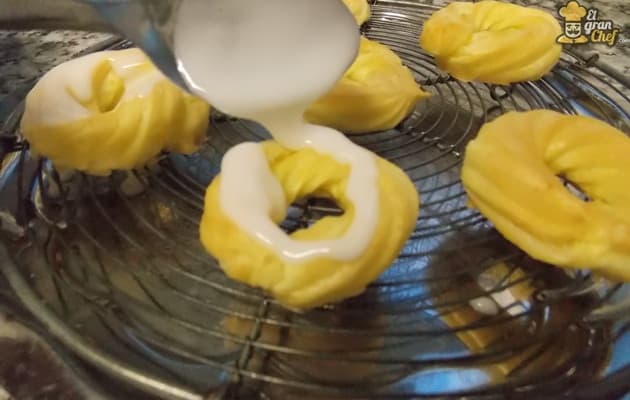 Colocar las rosquillas frías en una rejilla con una bandeja debajo y volcar sobre ellas el glasé.