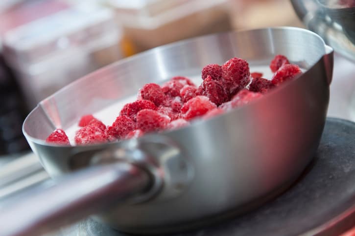 En una olla pequeña, calienta la miel y el agua. Cuando el líquido comience a hervir, agrega las frambuesas. Revuelve. Retira del fuego.