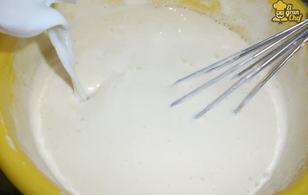 En segunda instancia, agregaremos la leche y el agua. Seguimos mezclando.