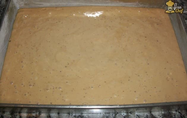 Finalmente, volcamos la mezcla en un molde rectangular de 20 x 30 cm, colocando un papel manteca por debajo para poder desmoldar fácilmente este bizcocho después de su cocción.