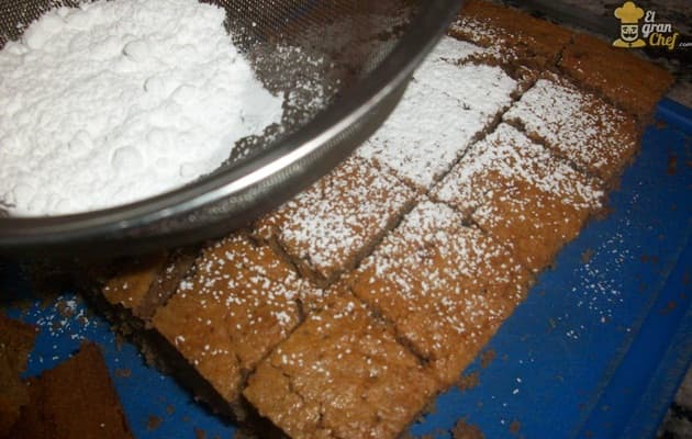 Para presentar, desmoldamos el rectángulo de bizcocho, cortamos cuadrados de aproximadamente 4 x 4 cm y espolvoreamos con azúcar impalpable.