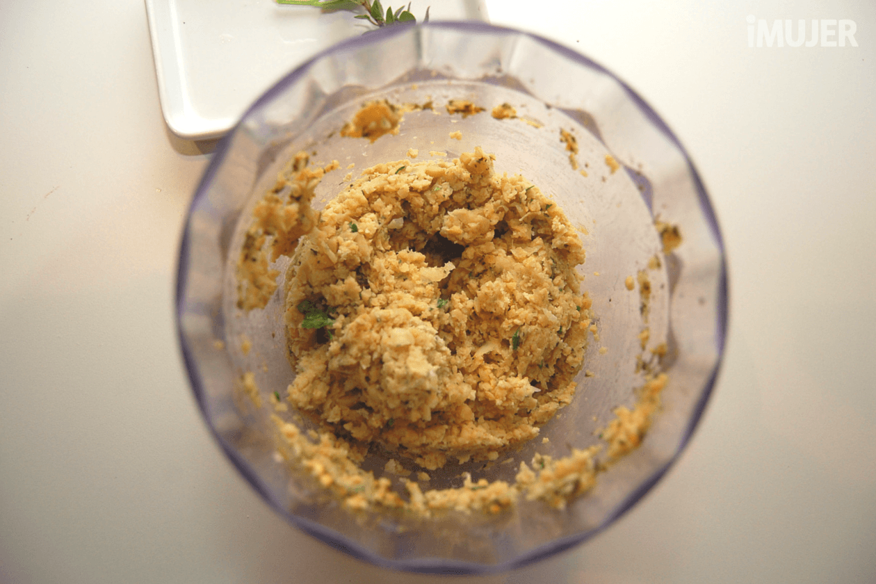 Agrega los garbanzos, harina, polvo de hornear, sal, pimienta y jugo de limón. Procesa hasta que todos los ingredientes queden integrados formando una especie de pasta.