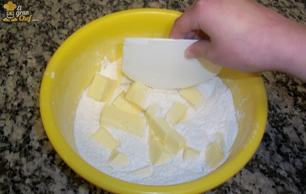 Para comenzar, cortamos la mantequilla en cubitos. Es imprescindible que la mantequilla esté fría, para poder trabajarla mejor. Si estuviera blanda, necesitaría de más cantidad de harina para que la masa obtenga la consistencia deseada.
