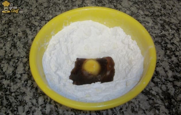 En un bowl o en la procesadora, colocamos los secos: harina y azúcar.