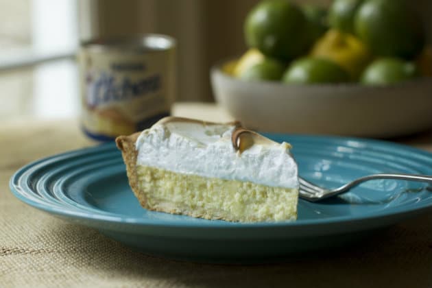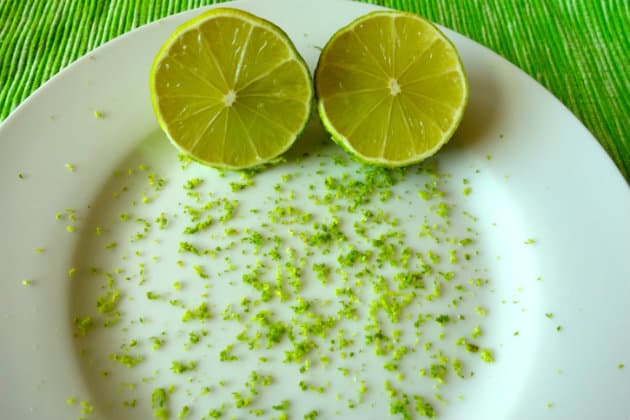 - Vierte la mezcla de lima sobre la corteza y llénala hasta el borde. Coloca el molde encima de la bandeja para hornear. Hornea por 50 minutos o hasta que esté completamente cuajado. Retira del horno.