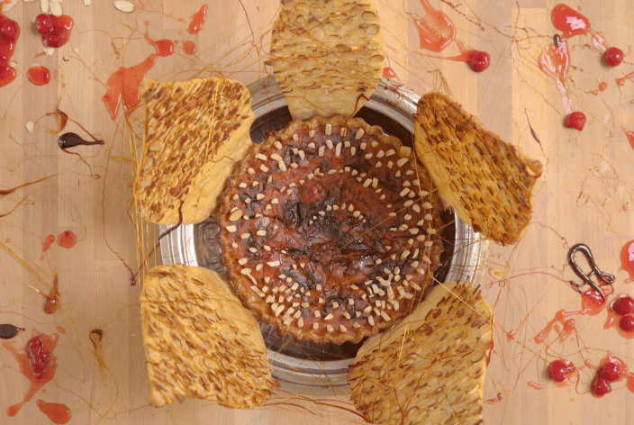 Una vez suficientemente frío, debes formar el rostro del Demogorgon, empezando a colocar las almendras picadas simulando el interior de la boca.