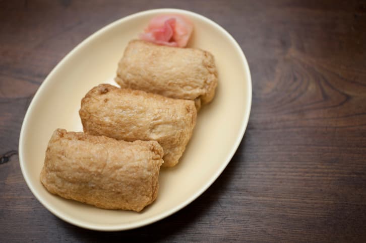 Inarizushi (稲荷寿司)Este es el sushi relleno. Se trata de una especie de saco pequeño relleno con arroz de sushi y otros ingredientes. Su nombre se debe en honor a la diosa sintoísta Inari, que según se dice, tenía un cariño muy especial por los productos hechos de arroz. El saco se hace con tōfu frito (abura-age, 油揚げ), con una tortilla muy delgada (fukusazushi, 帛紗寿司) o con hojas de col (kanpyō, 干瓢).