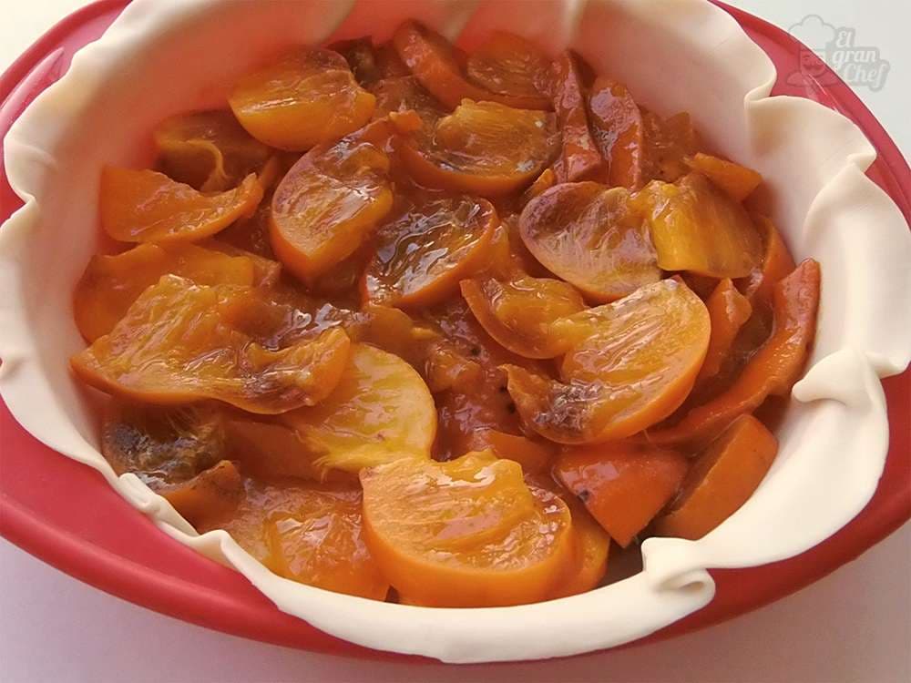 Esto fue bien, bien simple. Tomé la masa de hojaldre y forré una asadera para horno. Sobre la masa coloqué el kaki cortado en rodajas. Yo utilicé una asadera de silicona porque son ideales para desmoldar.