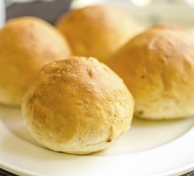 Con una cuchara, moldear 10 panes redondos en una asadera. Colocar en el horno hasta que se doren levemente (aproximadamente 30 min.). Deja enfriar completamente y colócalos en un envase de plástico cerrado hermético durante toda la noche. A la mañana siguiente están listos para comer.