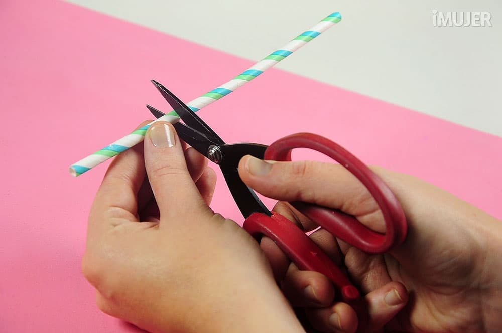 Corta los sorbetes en partes iguales, estas serán las piernas de las brujas. Hazles un pequeño corte en el vértice e introduce las botas.