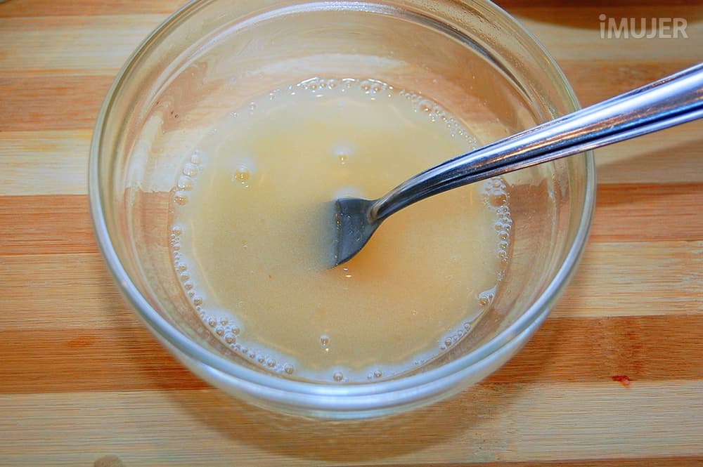 Hidrata la gelatina con el agua y calienta un poco en el microondas para que se active, deben disolverse todos los granitos de gelatina.