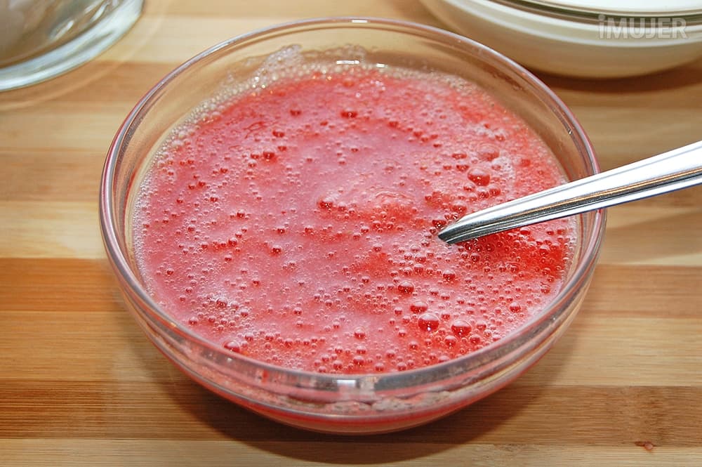 Combina la gelatina con la pulpa de frutas, en mi caso preparé dos mousse, una de fresas o frutillas y otra de limón.