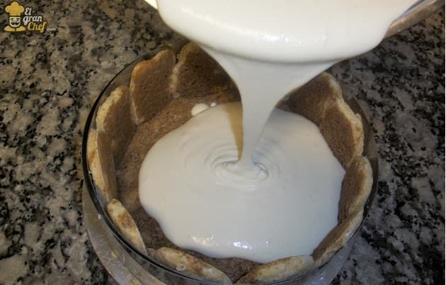 Cuando la tenemos lista, la volcamos lentamente sobre el molde con las vainillas embebidas en café.