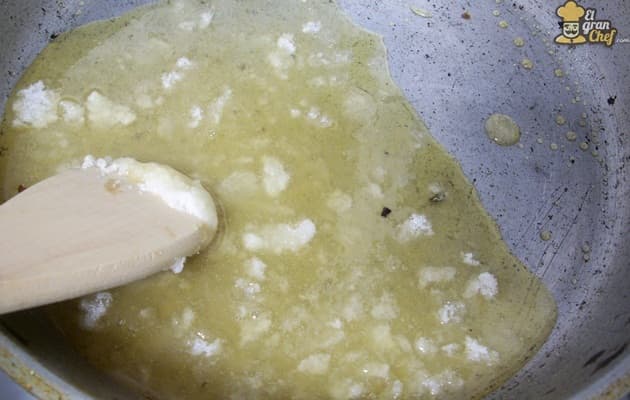 No revolvemos demasiado para que no se formen costras de azúcar sin disolverse. Revolvemos apenas con una cuchara de madera.