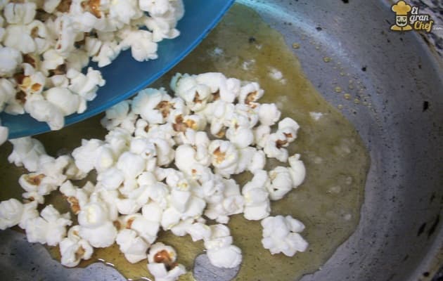 Cerramos la cacerola con la tapa correspondiente y escuchamos cómo revienta el maíz. A los 4 o 5 minutos, cuando se escuchen menos "explosiones", bajamos el fuego al mínimo para que no se quemen los granos de maíz que no hayan reventado, y sacudimos la cacerola (siempre con la tapa) para que bajen los granos que no estén tocando el fondo.