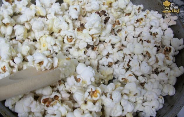 Revolvemos constantemente con una cuchara de madera así el caramelo se va adhiriendo al pochoclo. Además, de este modo haremos que el caramelo vaya tomando color más dorado de forma pareja.