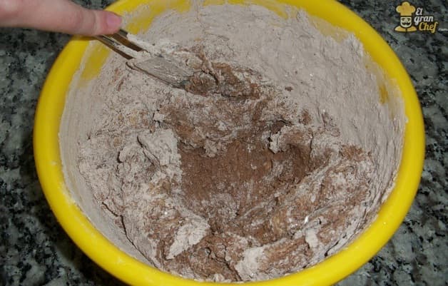 Ahora es momento de agregar los ingredientes secos. Los mezclaremos previamente y los agregamos en dos veces con la ayuda de una espátula, para que sea más fácil.