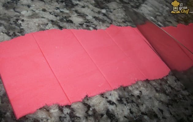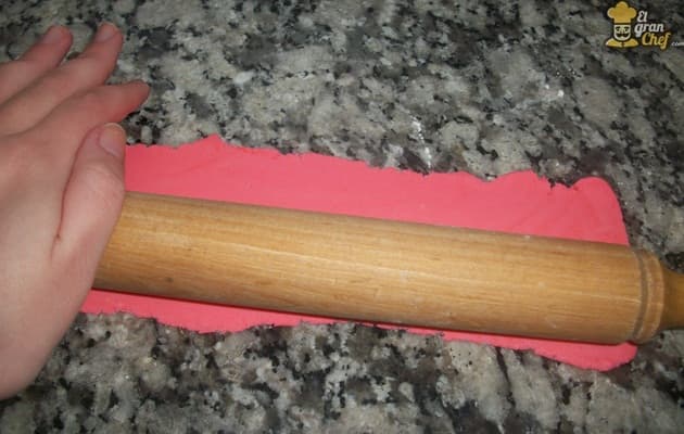 Primero, teñimos pasta de colores. Estiramos con el palo de amasar, ayudándonos con fécula de maíz si se nos pega en la mesada.