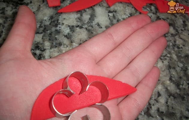 Sobre los restos de masa que nos vayan quedando, buscamos espacios para cortar los "moños" del regalo. Esto lo haremos con un cortante de flor, pero utilizando solo la mitad. La idea es usar dos o tres pétalos de la flor.