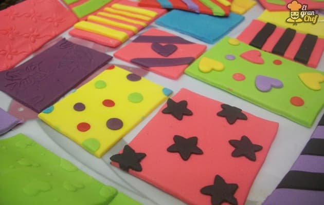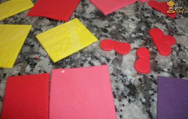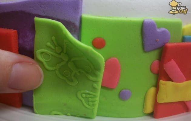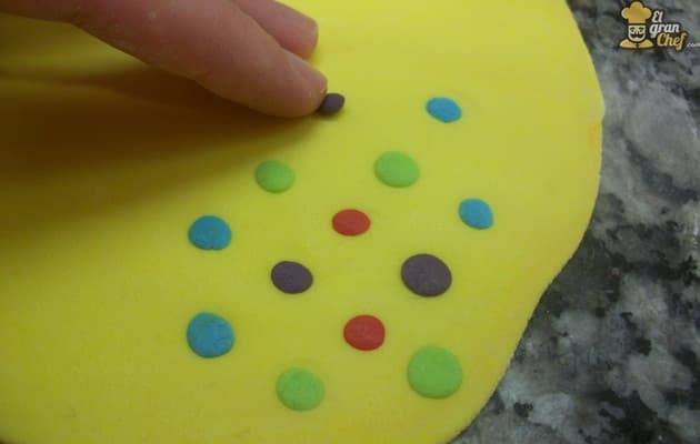 Otra opción de diseño de paquete es estirar la masa y colocar círculos de colores para que parezca un papel de regalo con lunares. Los colocamos a presión y finalmente rodamos el palo de amasar por encima para que queden adheridos.