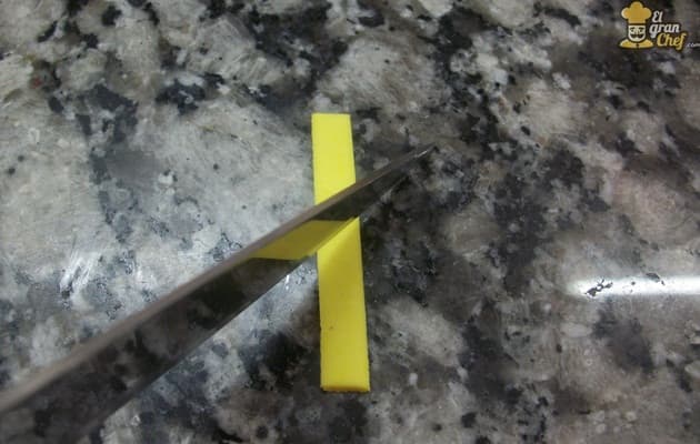 También cortamos tiras cortas y las cortamos de forma chanfleada con la cuchilla. Estas serán las tiras que caerán del moño del regalo.