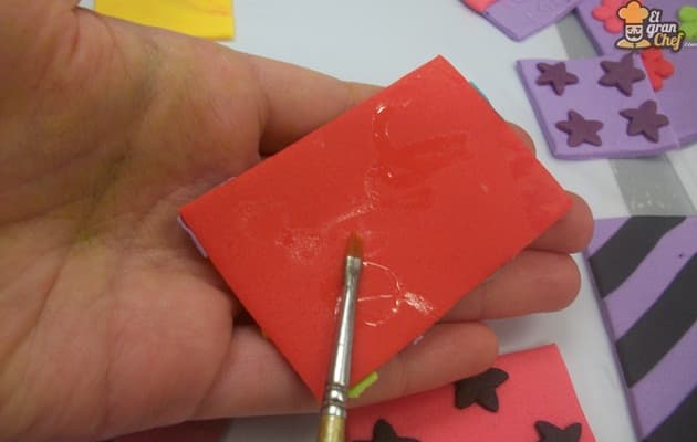 Con un pincel y apenas de agua (o glasée), humedecemos el lado de atrás de una de las piezas y la adherimos a la torta.