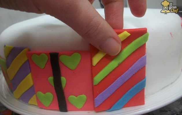 Pegamos sobre la cobertura y repetimos este proceso en todo el contorno de la torta.