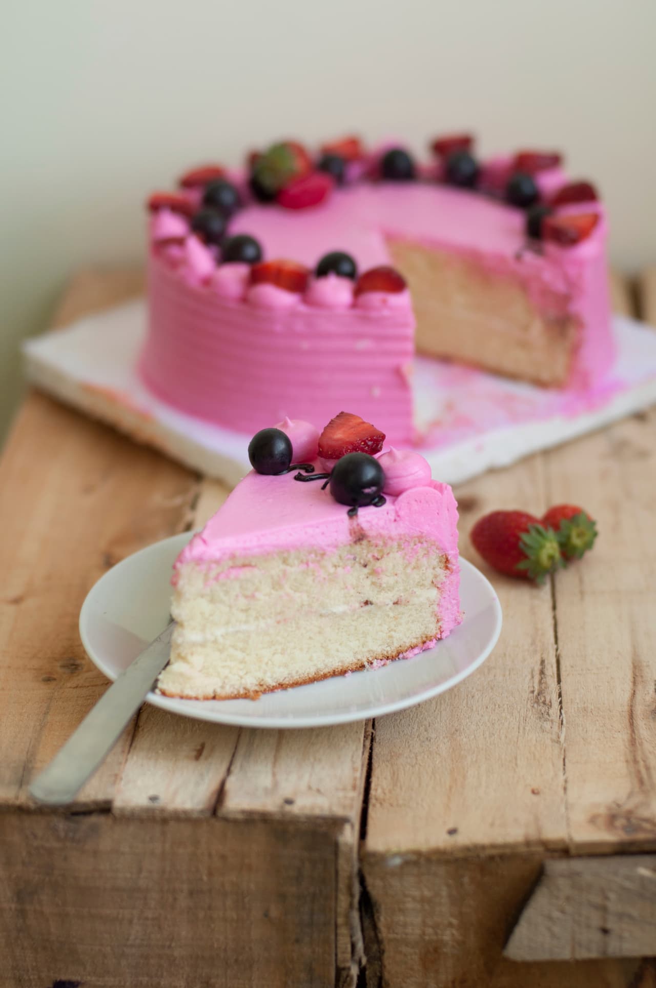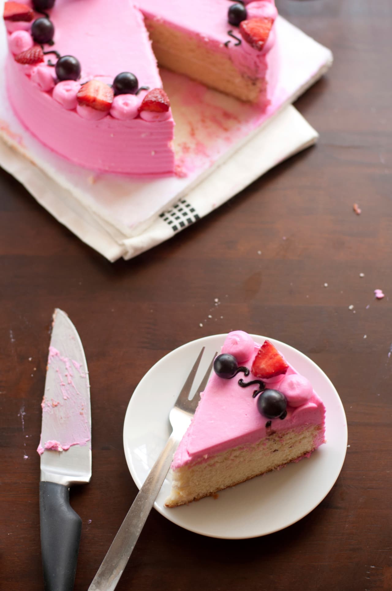 Prepara un poco de merengue italiano y agrega colorante rosado para decorar la torta. Recuerda guardar un poco de merengue para el relleno y listo. Decora utilizando una espátula, colocando fresas, uvas y hasta arándanos. ¡La decoración quedará fantástica!