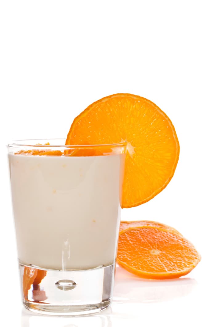 Previamente deberás cortar la media banana en rodajas. Colocar las rodajas en papel film y llevar al congelador por al menos, dos horas. Una vez que tengas las rodajas congeladas, colocarlas junto con la piña, el yogur, el zumo de naranja y el vodka en una licuadora. Licuar por un minuto o hasta obtener una consistencia cremosa a máxima velocidad. Servir en vasos bajos. Decorar con rodajas de naranja en el canto de los vasos.