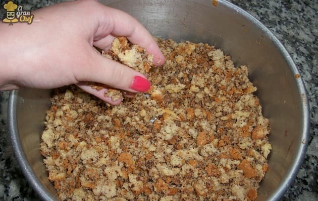 Comenzamos desmenuzando el bizcochuelo o las vainillas. Este paso puede realizarse a mano o en la procesadora. La idea es convertir todo en migas. No importa de qué sabor sea el bizcochuelo.